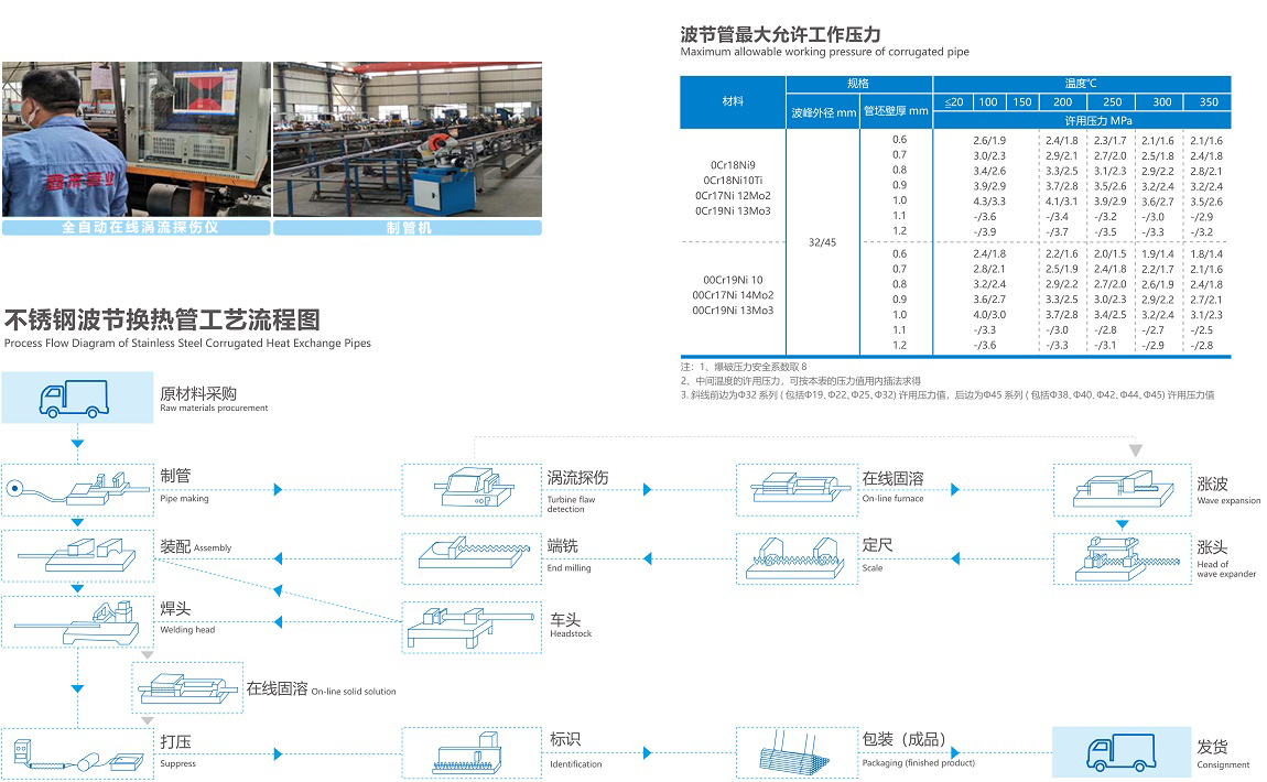 @ 波節(jié)管表面凹凸的外形,使流體在管內(nèi)形成較強的湍流,從而大大提高管內(nèi)外表面的換熱系數(shù),使換熱器整體換熱效率比列管式提高2-3倍;